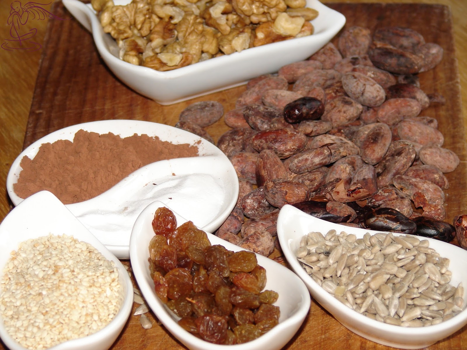 dodaję również: dwie garści ziaren kakaowca (najlepiej surowe fermentowane tylko i samemu uprażone na patelni, obrać z łuski i drobno posiekać) – nadają egzotycznego smaku